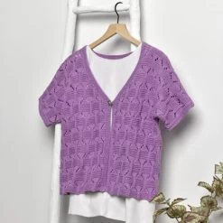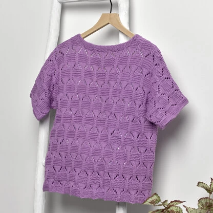 your spring and summer wardrobe knit in Leverett. The adorable short-sleeved sweater is perfect for warm weather layering. Marzipan is knit flat in pieces