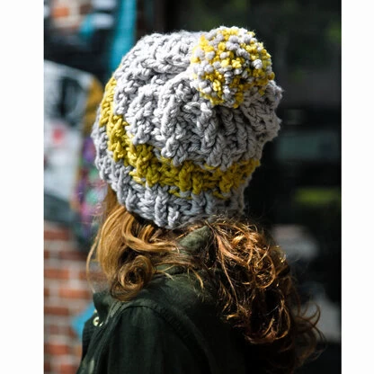 Vickie Howell’s Upward Spiral Beanie is simplicity itself. Crocheted in a tube from the top down, this cute and casual hat uses an easy cinched closure that requires no decreases and features a striking stripe of color and a fun pompom on top! Worked at a large gauge in Valley Superwash Super Bulky, this hat is a quick project that would be great for gifts.