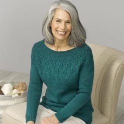 range of colors perfect for this women’s pullover. The diamond yoke pattern is charted and written out.